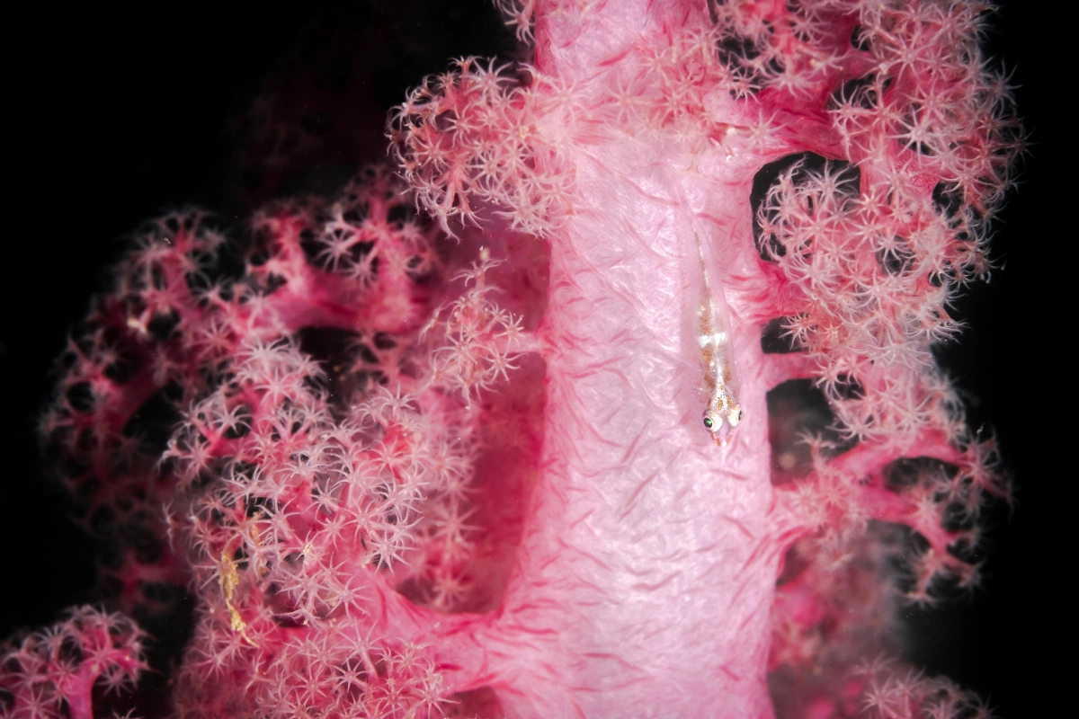 Nhánh san hô mềm màu đỏ. Phía trên là một dòng cá bống trắng đang kiếm ăn.