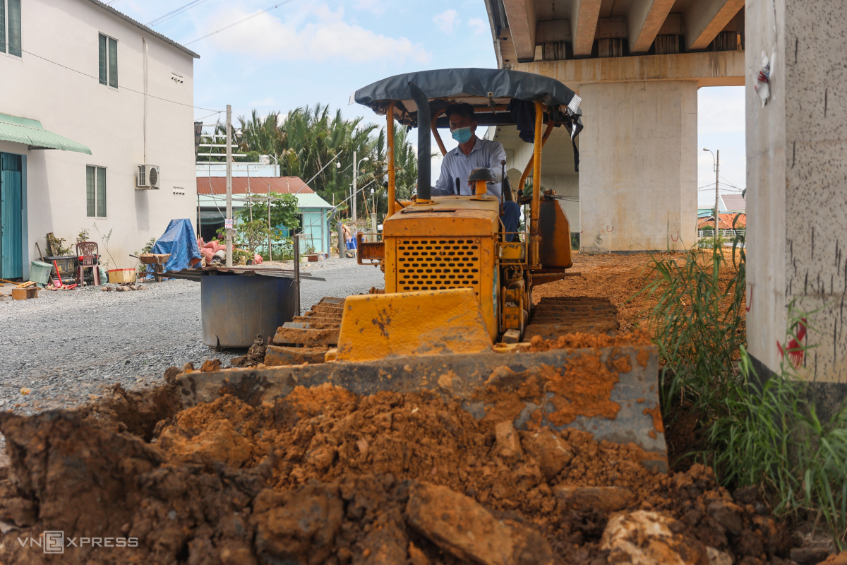 Bên dưới cầu nhiều công nhân, máy móc tất bật thi công các đường dân sinh. Thời gian tới, công trình sẽ được thảm nhựa đường dẫn, lắp biển báo, hệ thống chiếu sáng…