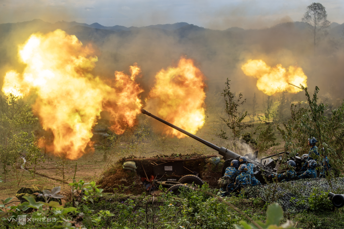 Sau khi có lệnh của chỉ huy đợt diễn tập, chiến sĩ pháo phòng không bắn 14 lượt pháo 57 mm vào mục tiêu trên đồi.