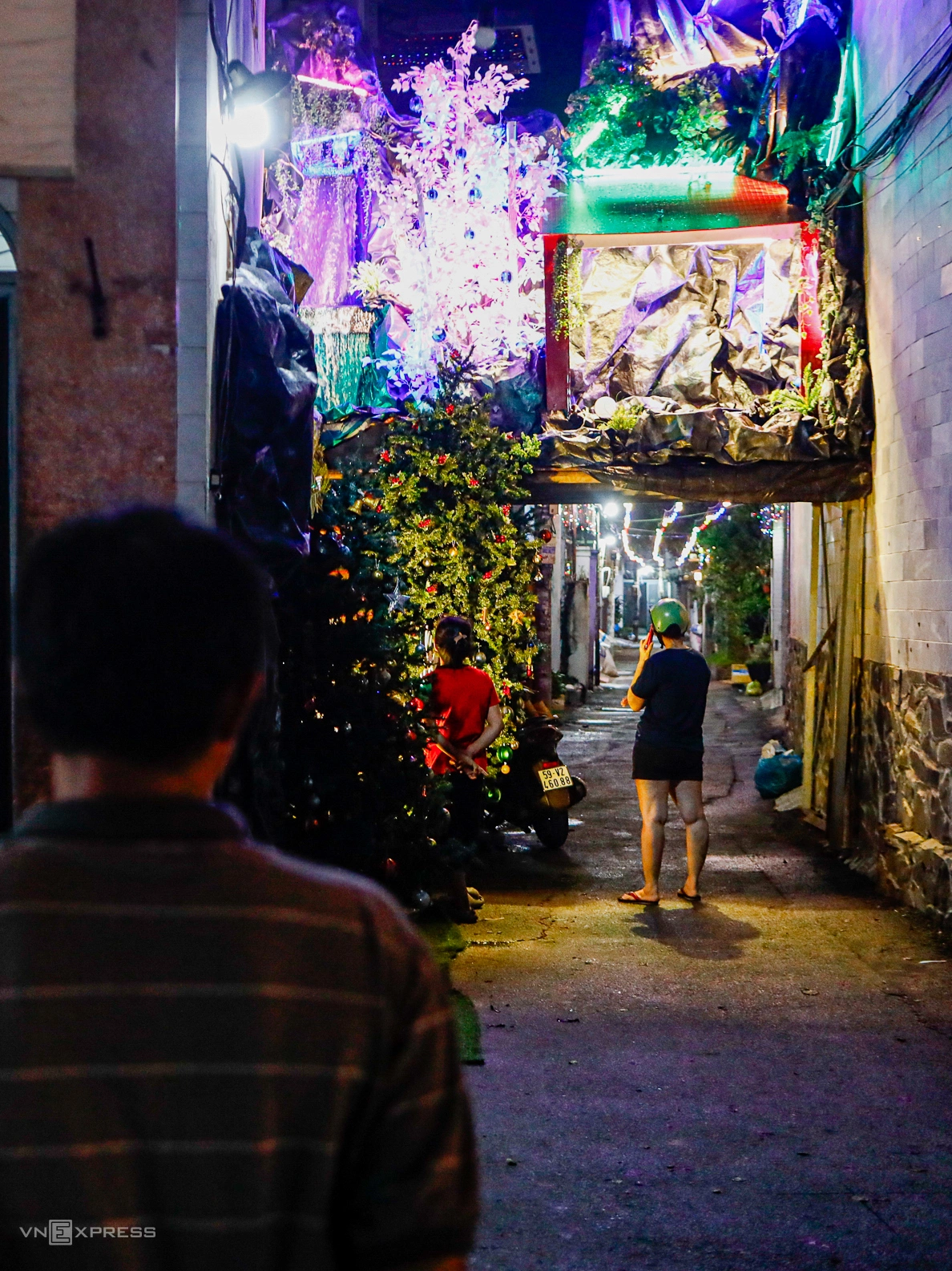 Hẻm 82 Chấn Hưng, quận Tân Bình rực rỡ sắc màu của những chùm đèn led, cây thông và hang đá, tối 15/12. Một giáo dân cho biết khoảng 3 tuần trước, những người theo đạo trong xóm cùng đóng góp và trang trí mừng Giáng sinh.
